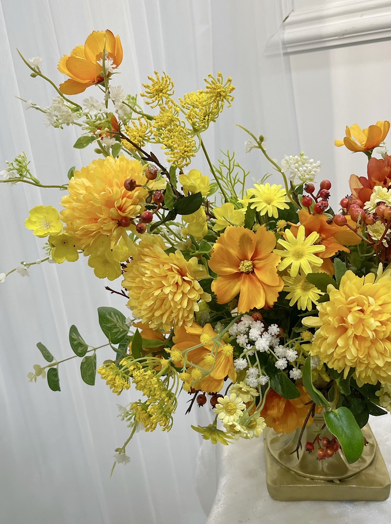 Bình hoa giả để bàn trang trí với chất liệu hoa vải lụa cao cấp, được phối các màu vàng cam nổi bật từ những mẫu cành hoa nhỏ li ti, giúp mẫu bình hoa lụa thêm phần tự nhiên..