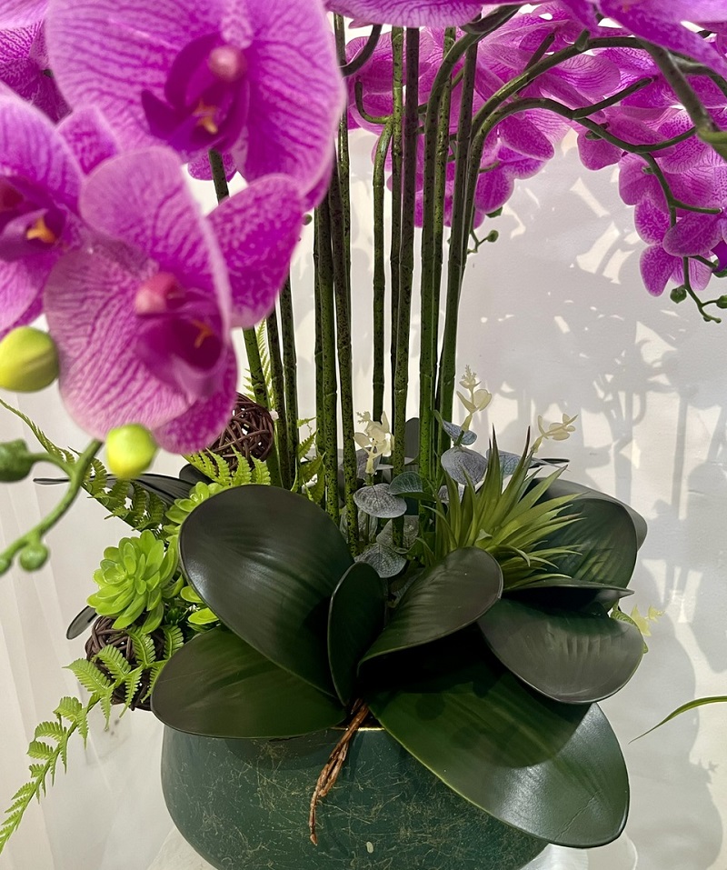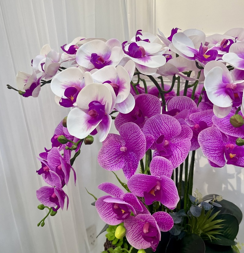 Mẫu chậu lan hồ điệp lụa cao cấp trang trí để bàn giúp không gian thêm sang trọng hơn. Chất liệu chậu gốm sứ phong cách tân cổ điển phù hợp với nhiều nội thất. Lan tím tượng trưng cho sự mạnh mẽ độc lập nhưng không kém phần quyến rũ kiêu sa. Phù hợp tặng tân gia, và khai trương.