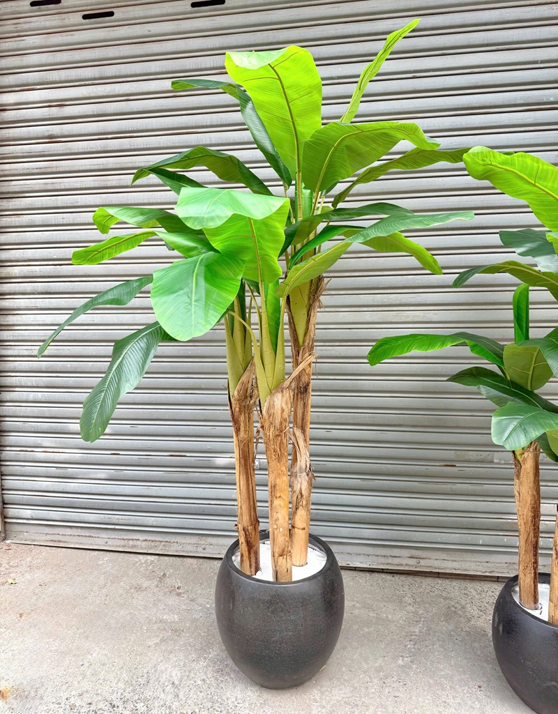 Cây chuối giả được mô phỏng rất giống cây chuối thật, phù hợp trang trí trong nhà hoặc showroom trưng bày.. mang lại không gian xanh . Ngoài ra sản phẩm cây chuối giả thường được trang trí nhà hàng mang âm hưởng quê hương, hoặc trang trí tiệm spa làm đẹp.