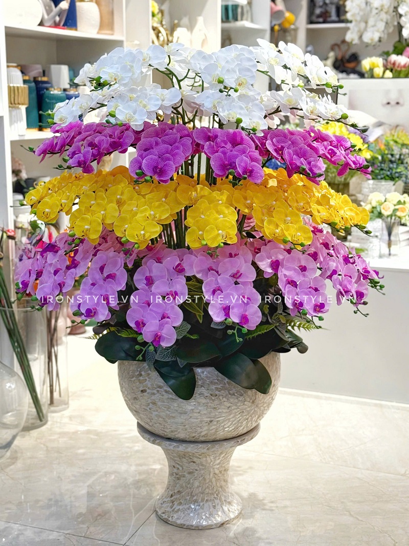 Chậu hoa lan giả được cắm lan trắng xòe tròn, với kích thước lớn có thể trang trí ở sảnh, mang lại vẻ đẹp sang trọng. Lan có nhiều màu nếu khách muốn thay đổi màu lan.