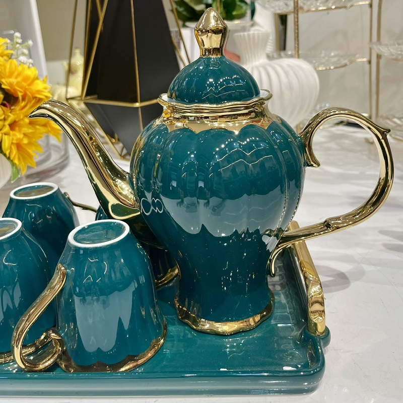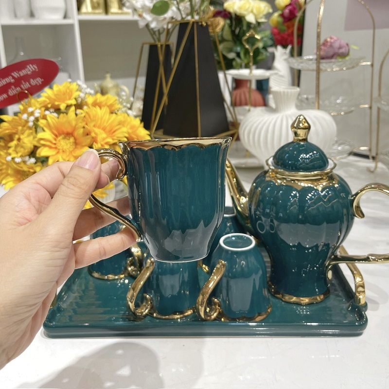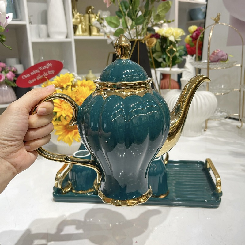 Bộ ấm trà sứ xanh viền vàng cao cấp