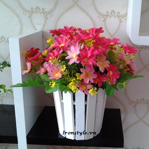 - Sản phẩm bao gồm chậu gỗ và hoa vải.