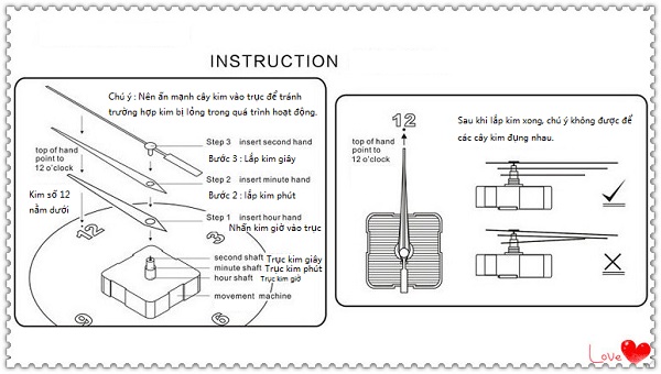 Hướng dẫn lắp ráp : Đồng hồ chỉ cần dán lên tường, cách lắp kim vào trục xem hướng dẫn bên dưới. Đồng hồ chạy bằng pin tiểu